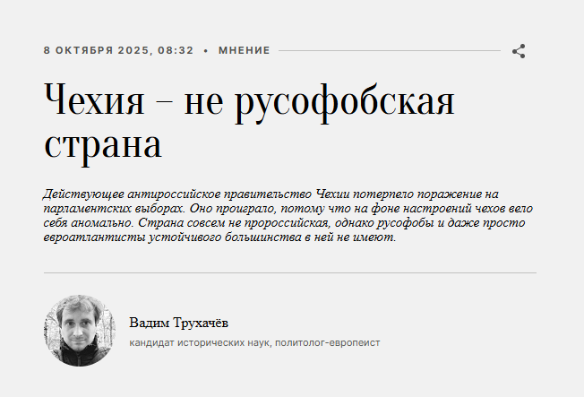 «Влада радикально антиросійського прем’єра Фіали була для Чехії аномалією, яку виправили останні вибори. Настав час викреслити Чехію зі списку русофобських держав», — цитує його Ізвестія.
