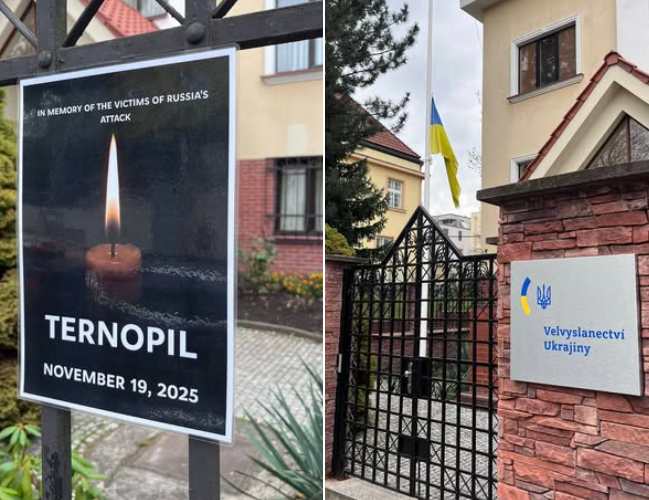 Українські дипломатичні установи в Чехії приспустили Державний прапор України на знак скорботи за загиблими внаслідок масованої російської ракетної атаки на Тернопіль.