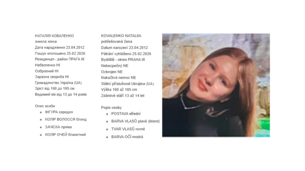 Про зникнення дівчини з району Розтока-у-Праги повідомила її мати. За інформацією поліції, востаннє вона бачила свою доньку в неділю, 22 лютого, повідомивши, що того ж дня Наталія пішла на прогулянку зі своєю подругою, від якої мала повернутися додому.