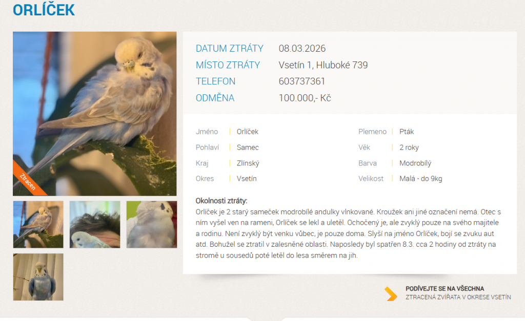 За інформацію, що допоможе знайти птаха, власники обіцяють винагороду 100 тисяч чеських крон.